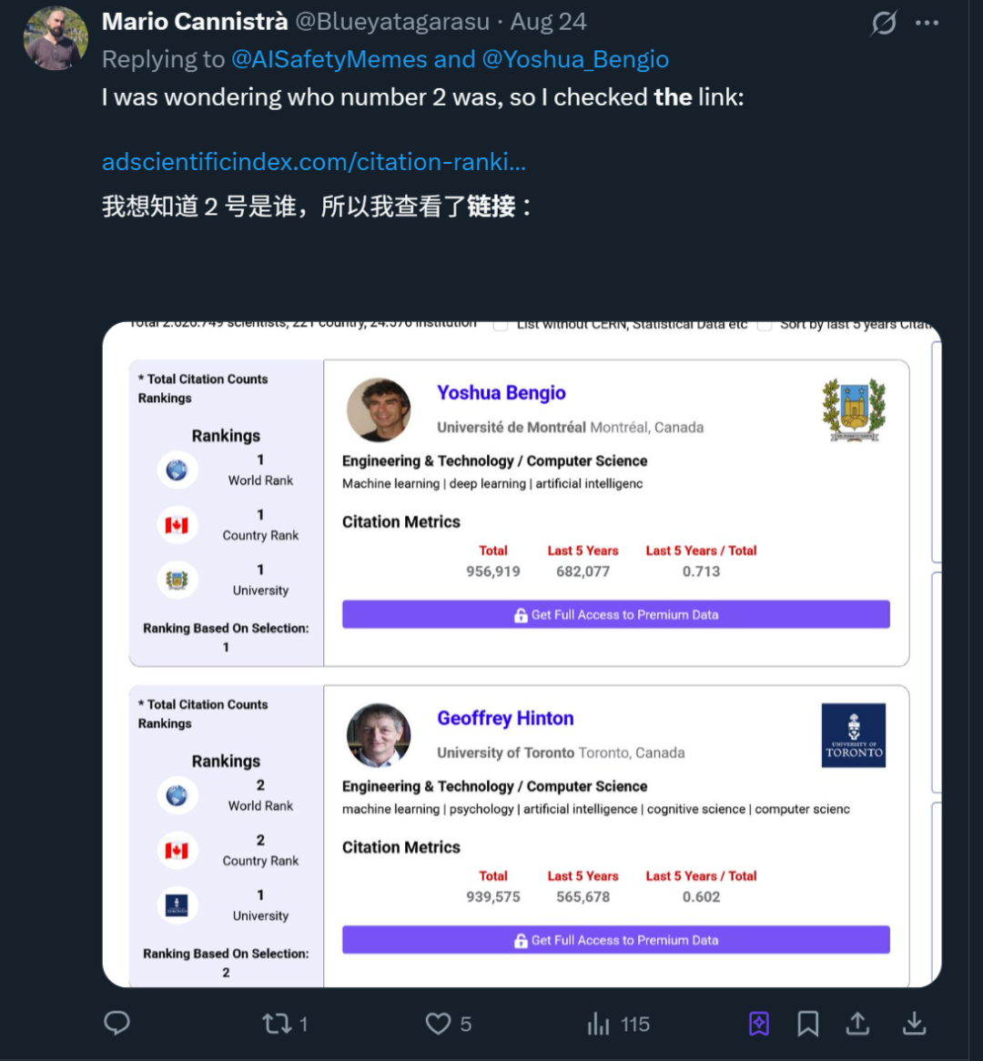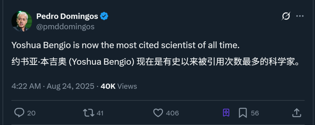 在这之前,早在2018年,Bengio就是世界计算机研究者中单日引用次数最高的人(同一年获图灵奖),2022年还一举成为世界上被引用次数最多的计算机科学家。