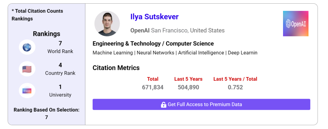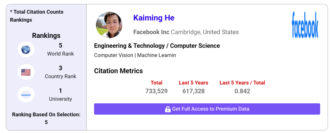 评估指标包括H-index、i10-index和总引用数这三个,每个指标都提供“整个职业生涯”与“最近5或6年”两个时间段的数据(兼顾长期积累与近期活跃度),索引主要基于公开的Google Scholar个人资料,经过多层清洗和审核处理。