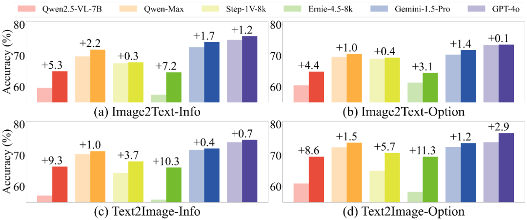 结果令人意外:即便是表现最强的Step-3,准确率也仅为79.1%,这与它们在其他基准上近乎完美的表现形成了鲜明对比。更有趣的是,开源模型Qwen2.5-VL-7B准确率仅为56.8%。