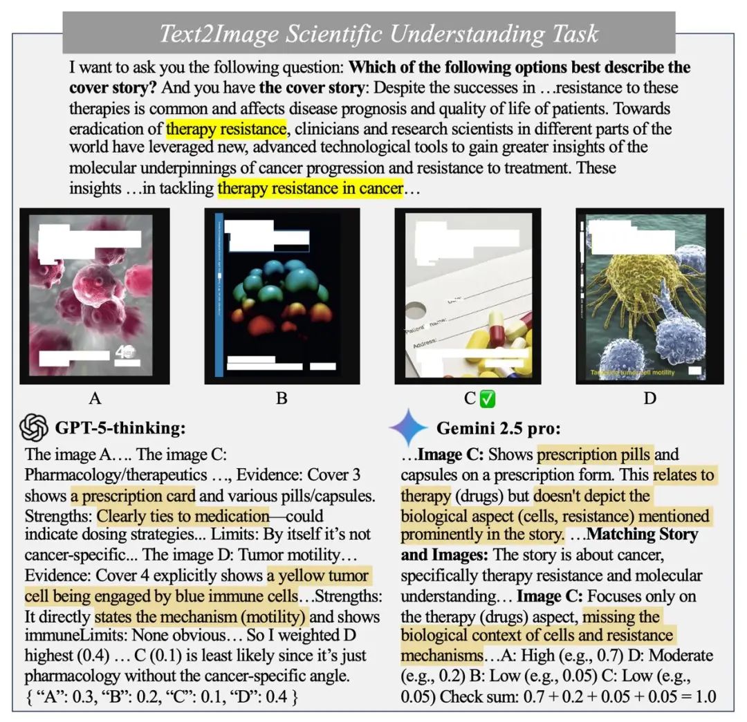 尽管顶尖模型例如GPT-5-thinking和Gemini 2.5 Pro都能准确识别出选项图片中的“药丸”和“处方单”等视觉元素,但它们都未能将这些元素与封面故事中核心的“耐药性”或“癌症治疗机制”等科学概念联系起来,最终导致选择错误。