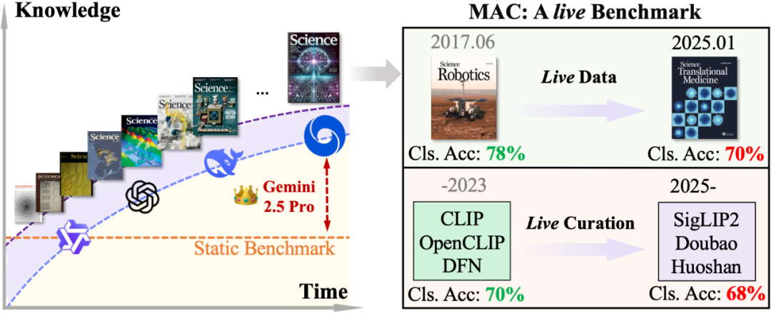 为了应对这一挑战,上海交通大学王德泉教授课题组巧妙地将“动态基准”这一理念与不断更新的科学前沿相结合,提出了MAC(多模态学术封面)基准:既然科学知识本身在不断演进,为什么不用最新的科学内容来测试AI呢?