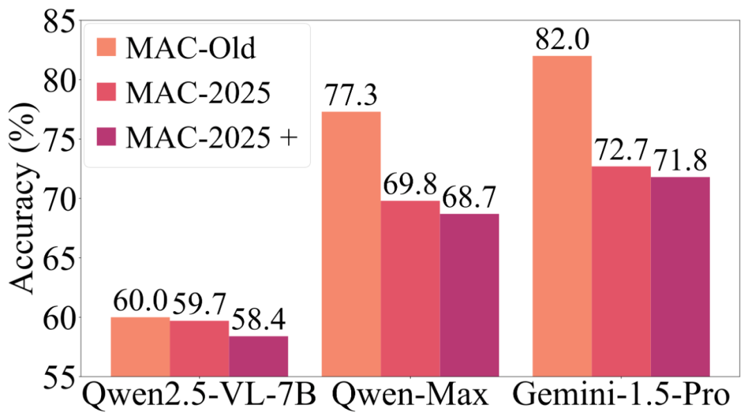研究团队做了一个巧妙的对比实验:让模型分别在早期期刊数据(MAC-Old)和最新数据(MAC-2025)上测试。结果发现,所有模型在处理新知识时都表现出明显的性能下降。