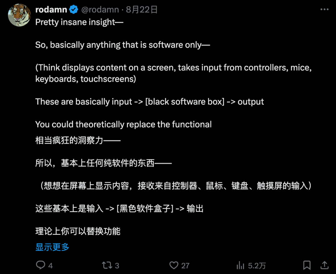 洞察力够强啊!基本上所有纯软件的东西,理论上你可以用一个经过训练的模型来替代功能性的黑箱,使其完成同样的事情。
