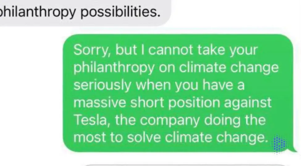 马斯克的回答则毫不客气:“对不起,当你大规模做空特斯拉——这个为解决气候变化做出最大贡献的公司时,我无法认真对待你在气候变化方面的慈善事业。”