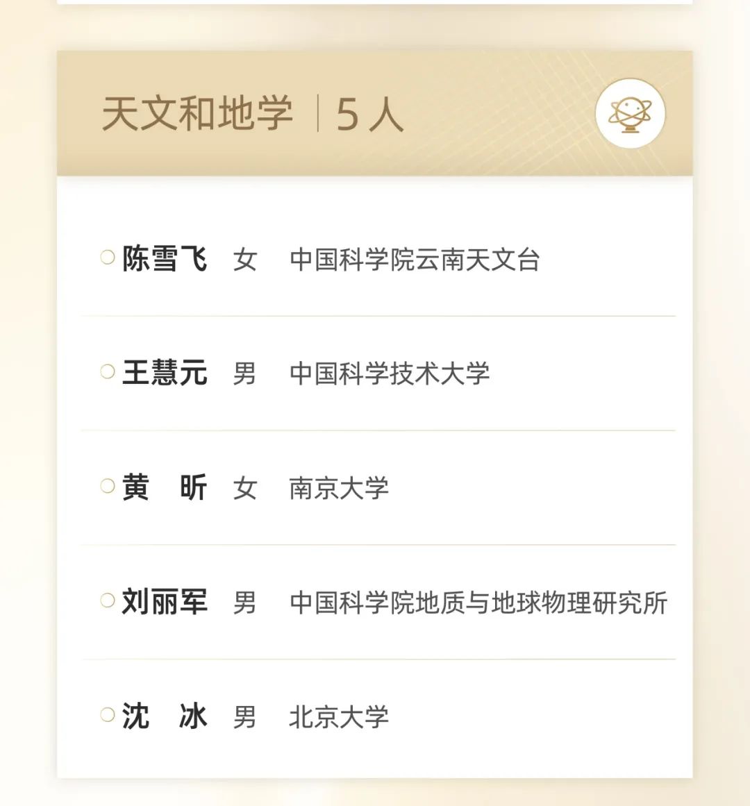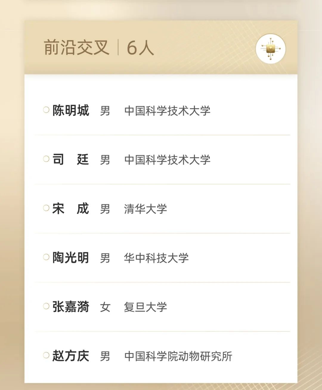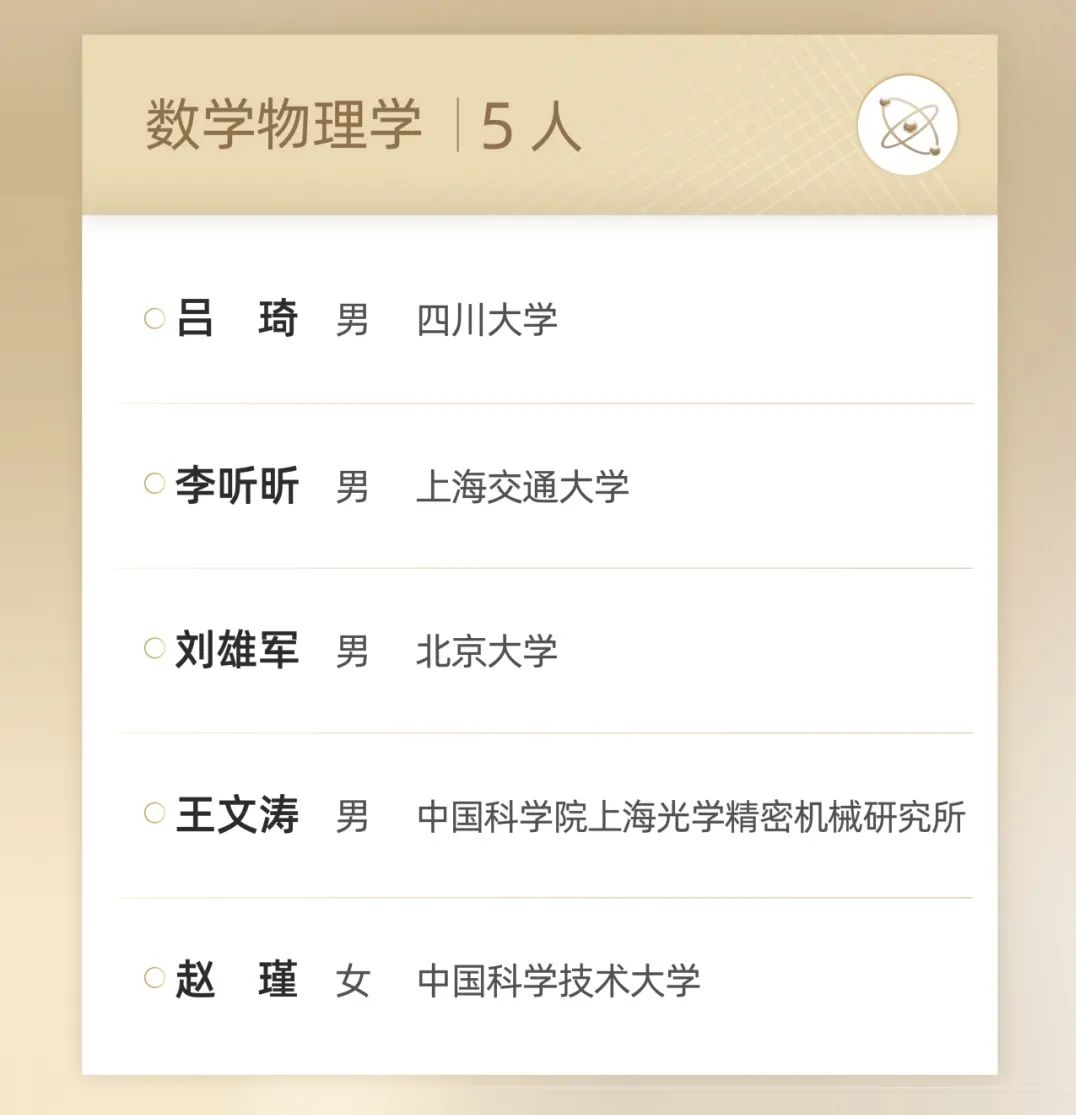 其中数学物理学5人、化学新材料5人、天文和地学5人、生命科学5人、医学科学5人、信息电子6人、能源环境5人、先进制造4人、交通建筑4人、前沿交叉6人。