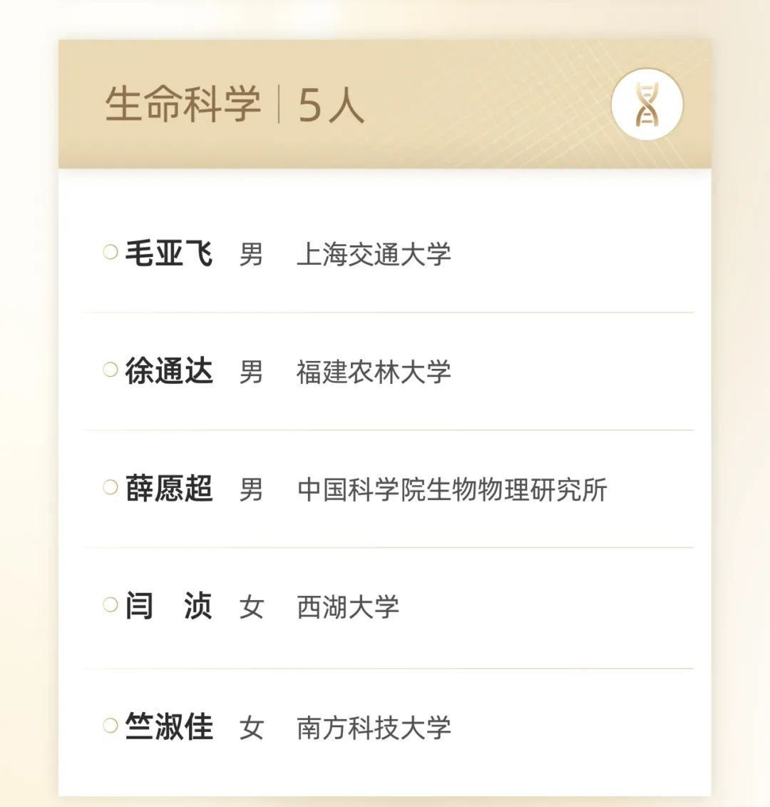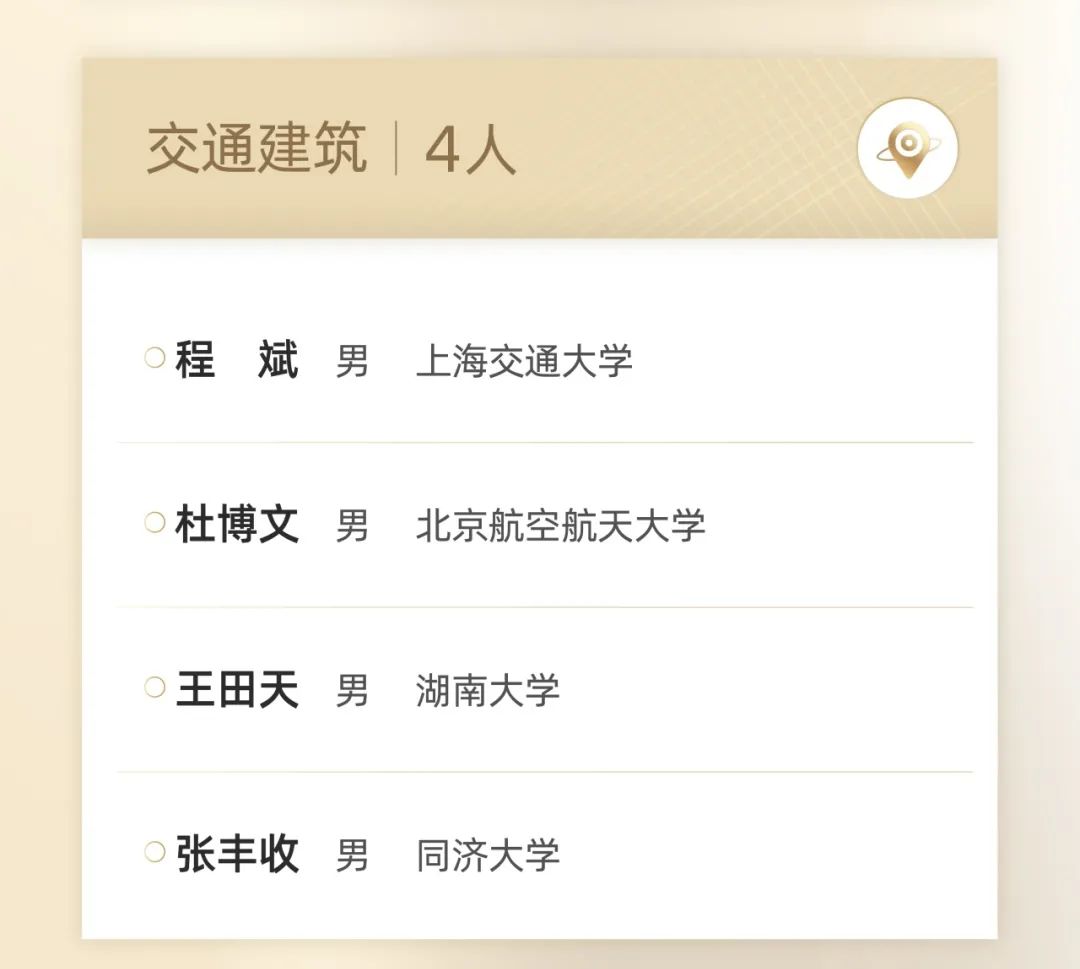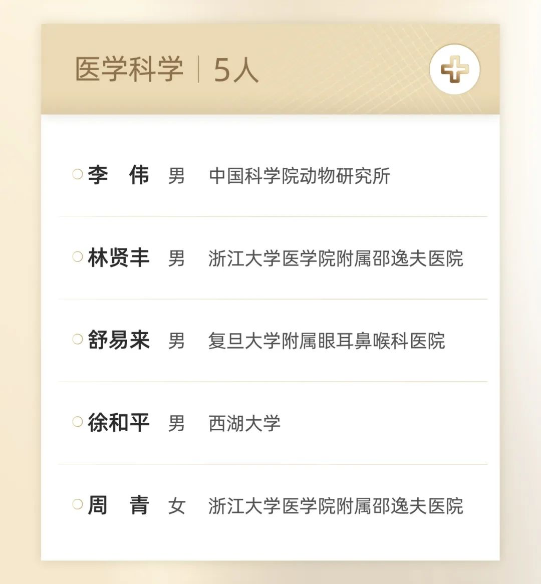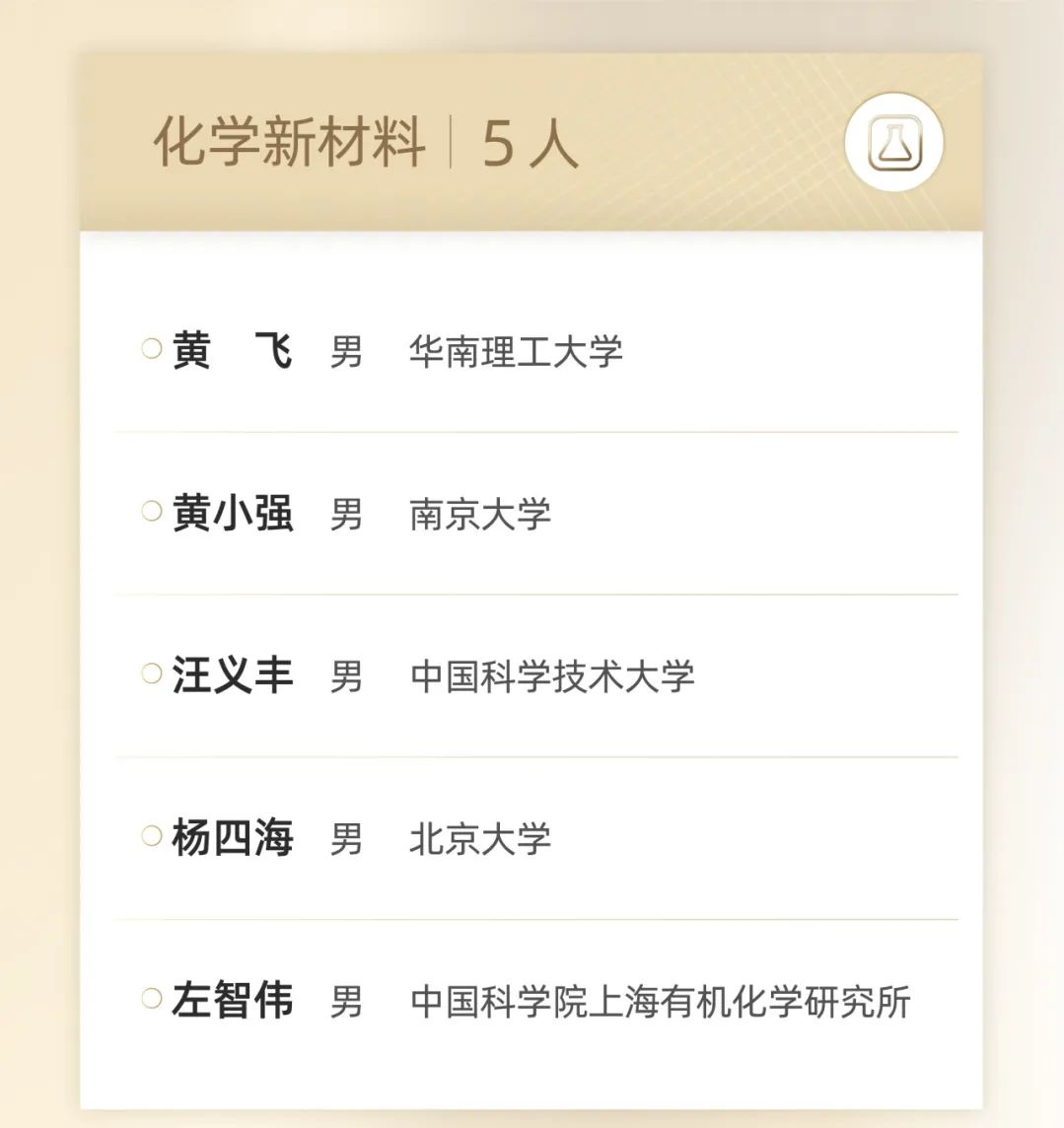 其中数学物理学5人、化学新材料5人、天文和地学5人、生命科学5人、医学科学5人、信息电子6人、能源环境5人、先进制造4人、交通建筑4人、前沿交叉6人。
