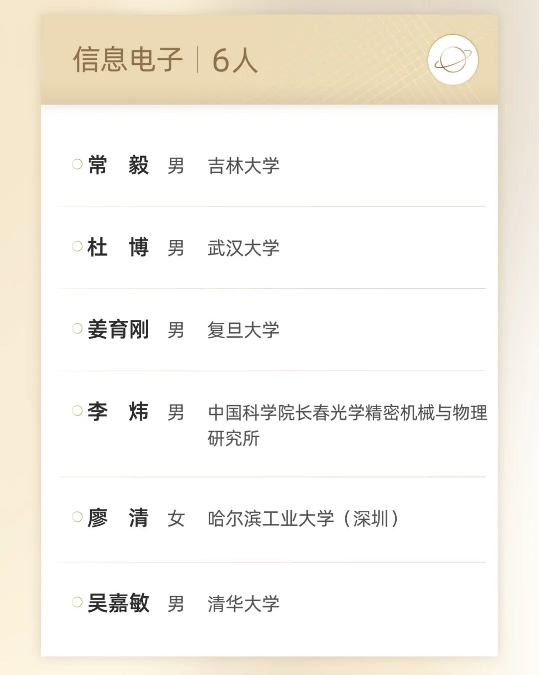 在本届科学探索奖信息电子领域共有6位获奖者,其中3位为年轻科学家。