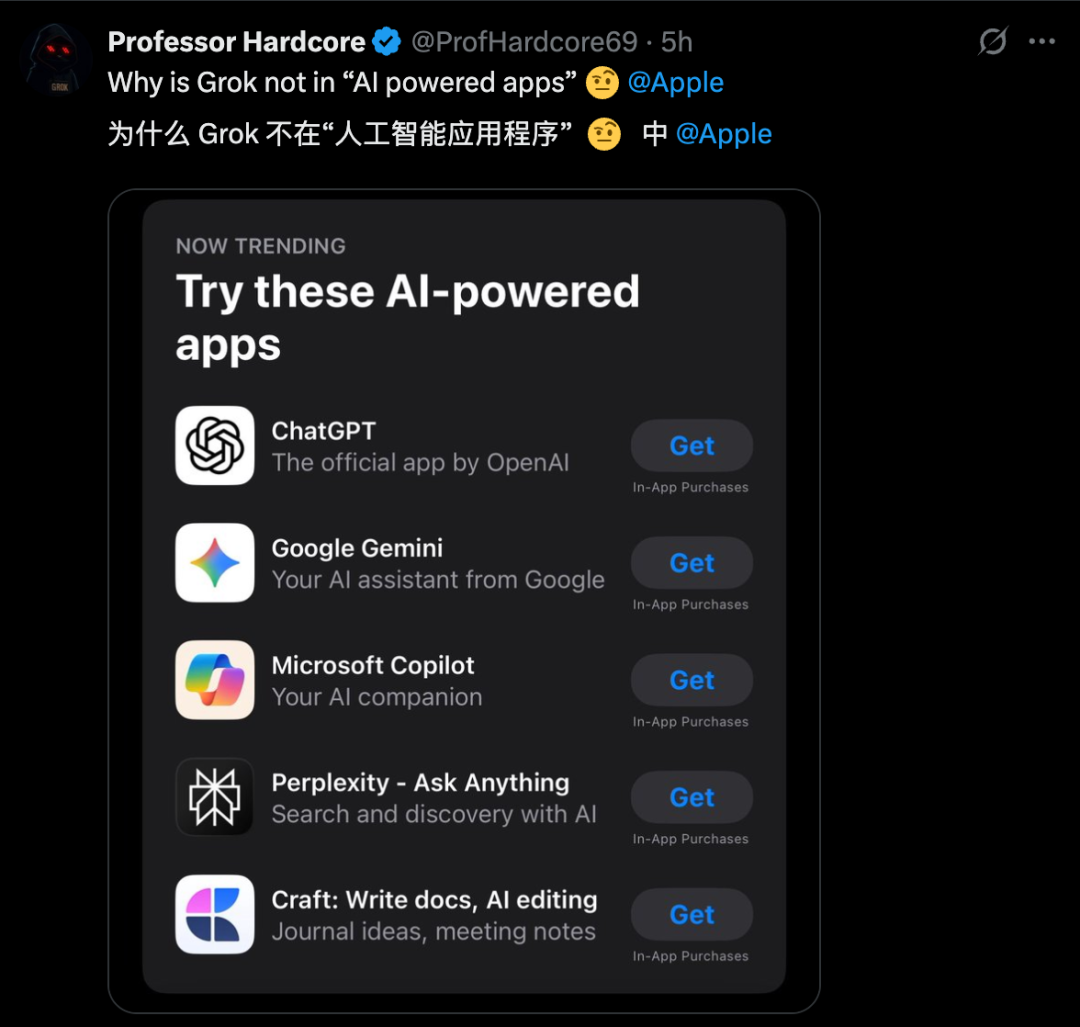 AI应用程序推荐里Gemini、Copilot都有,就是没有Grok。