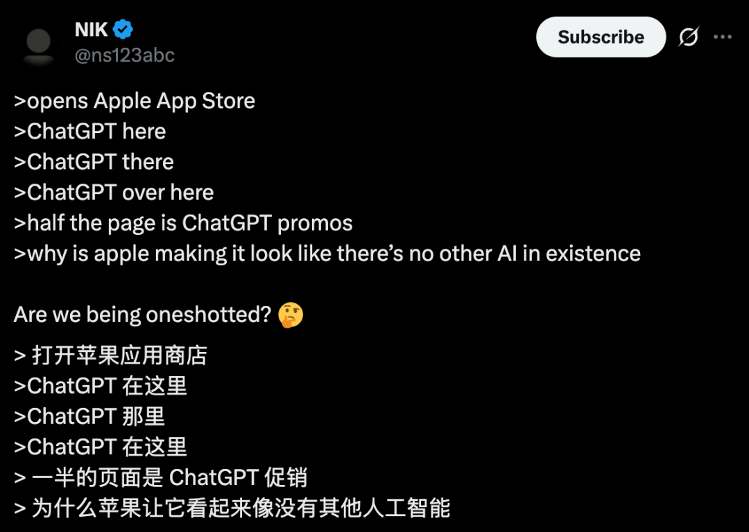 整个商店甚至像是ChatGPT大卖场,马斯克甚至嘲讽苹果是OpenAI旗下的公司……(倒反天罡.jpg)
