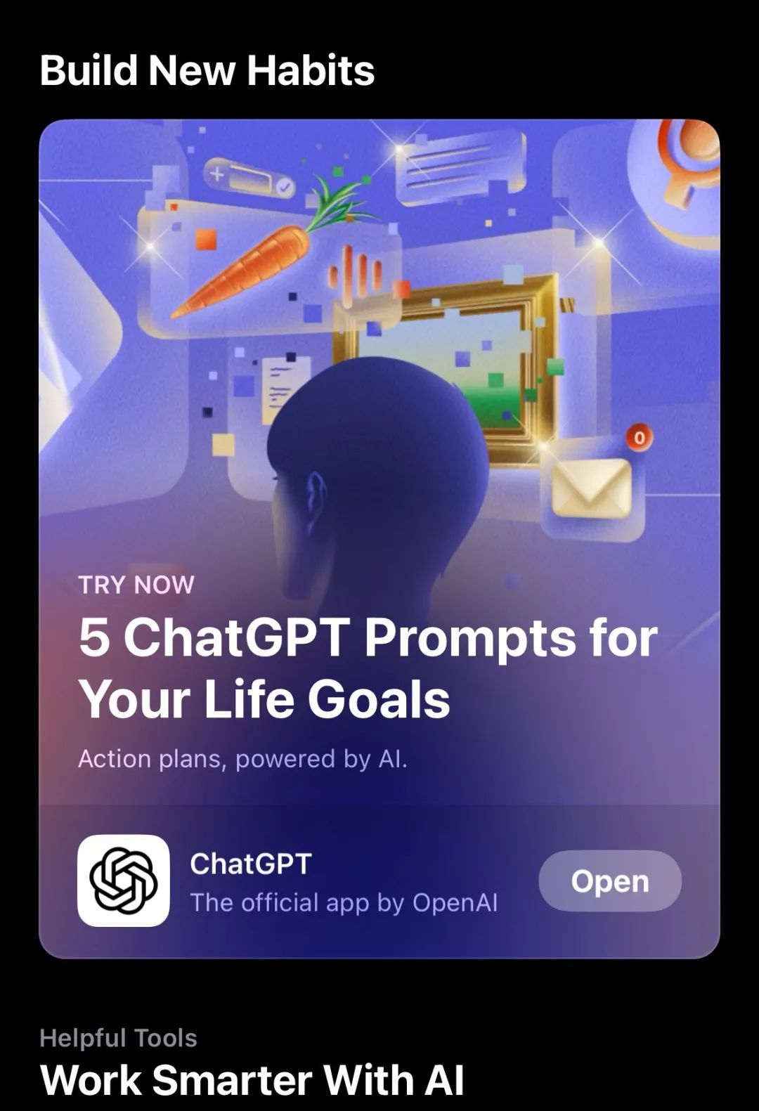 网友也确实发现,现在打开苹果商店铺天盖地都是ChatGPT的广告: