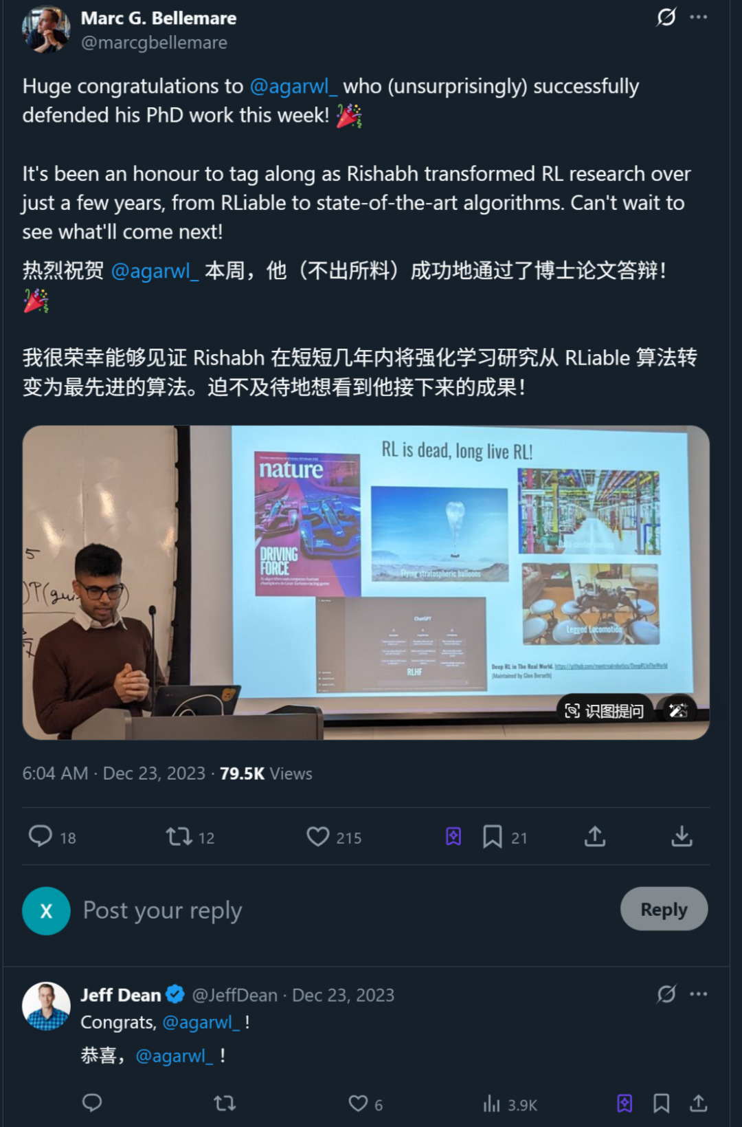 直到2023年,Marc Bellemare发了一条提前庆祝他通过博士毕业答辩的推文,连谷歌首席科学家Jeff Dean这样的大佬也赶来祝贺。