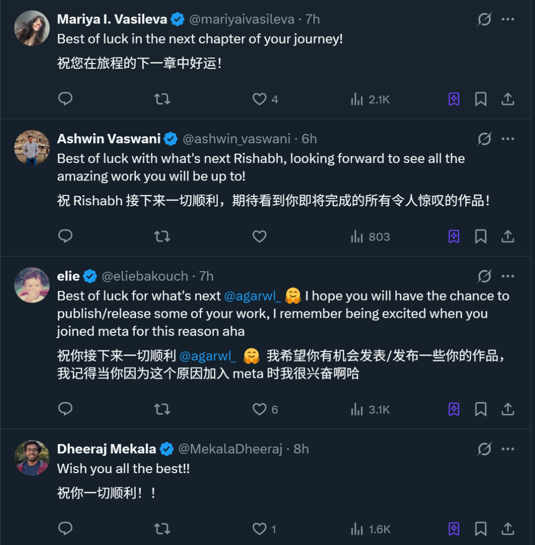 如今随着Rishabh Agarwals的离开,网友们也纷纷替Meta惋惜又损失了一员大将。