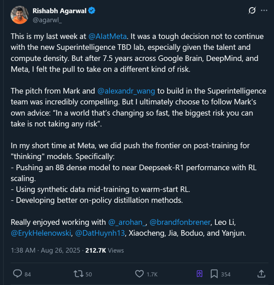 最新消息,Meta万引强化学习大佬Rishabh Agarwal即将离职,还留下了一篇让人浮想联翩的小作文: