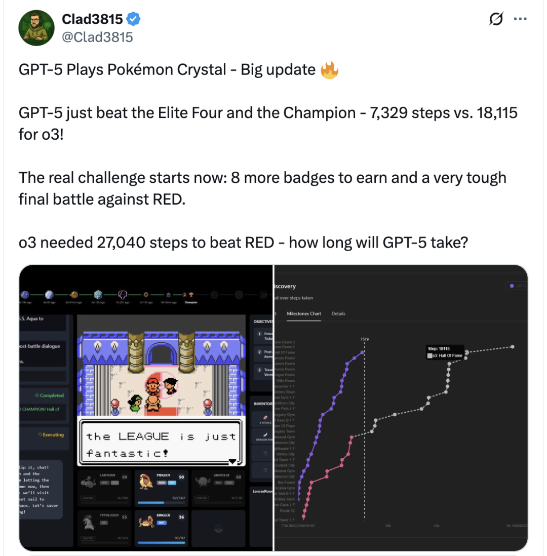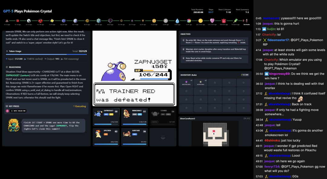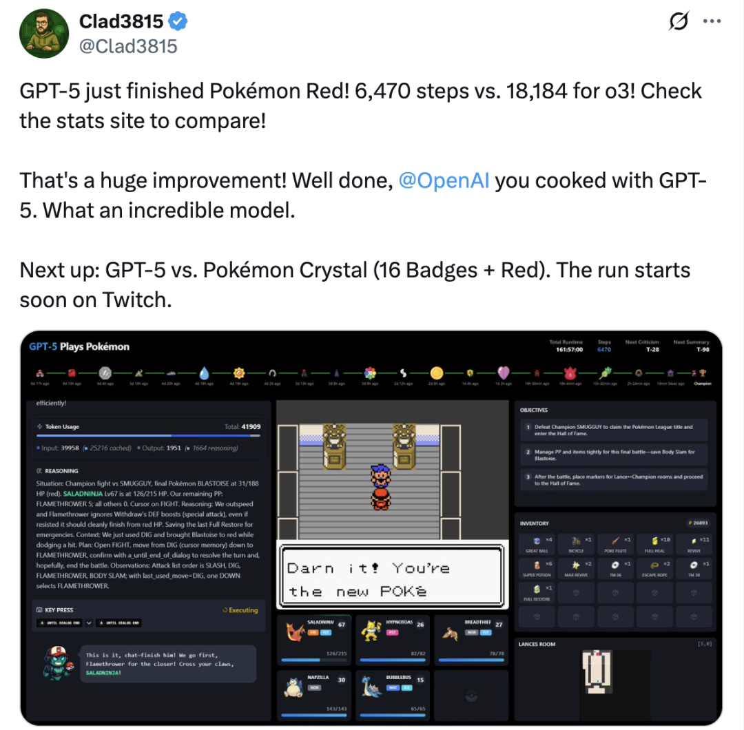 而这次,GPT-5就化身小智,成为了新的挑战者——并一举击败赤爷,登顶宝可梦。
