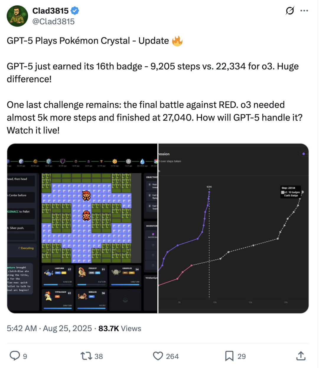 根据推特博主Clad3815的最新战报,GPT-5仅用9517步就放倒了赤爷,通关《宝可梦水晶》。