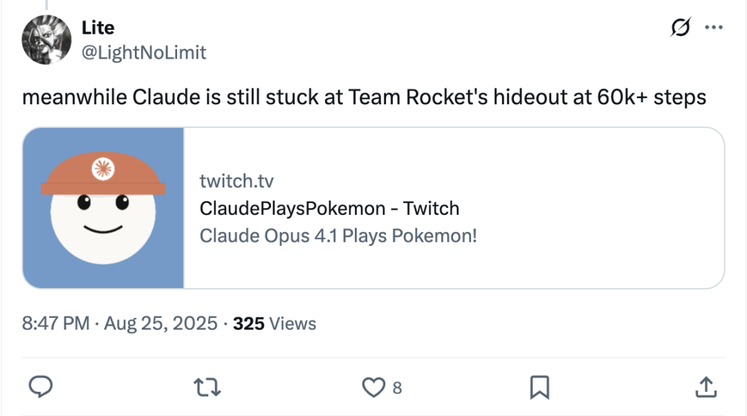 其中,Gemini 2.5 Pro在今年五月的直播中,成功通关了《宝可梦蓝》,而Claude就比较惨了,至今仍被困于火箭队。
