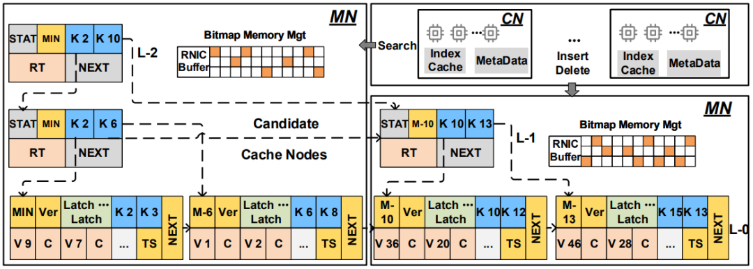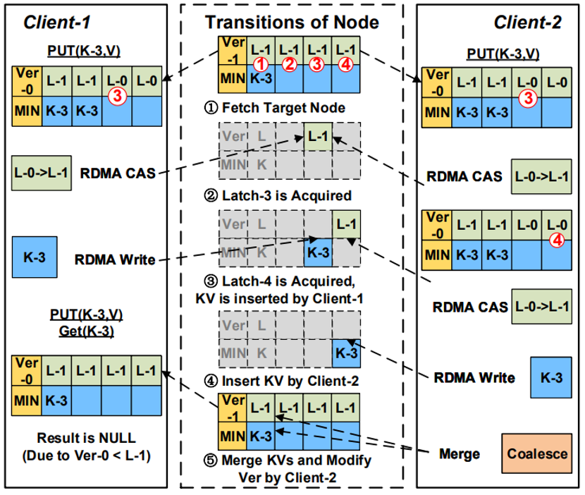将并发控制的粒度从节点级下降到条目级。在每个叶子节点内预留多个槽位Slots和对应的闩锁Latch,写入操作时,客户端通过RDMA_CAS竞争一个空闲槽位的闩锁,而不是竞争整个节点的锁,实现同一个节点的不同槽位并发写入,极大地减少了竞争。叶子节点支持动态调整叶子数据范围、自动扩缩,将热点区域隔离以减少后续该节点上的竞争,显著降低了写密集型和高偏斜(skewed)工作负载下的争用,提高吞吐量同时降低了尾延迟。
