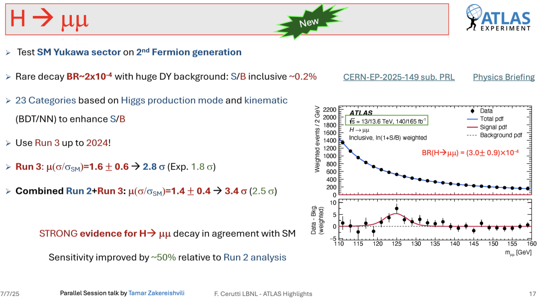 通过结合Run-2和Run-3数据集,ATLAS已经发现了H→μμ衰变的证据,其相对于纯背景假设的观测显著性达到3.4个标准差。