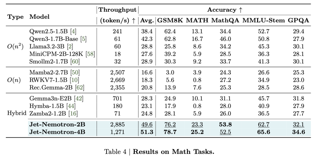 综合来看,Jet-Nemotron-2B和Jet-Nemotron-4B在这些领域的表现均与Qwen3-1.7B-Base相当,甚至更胜一筹。