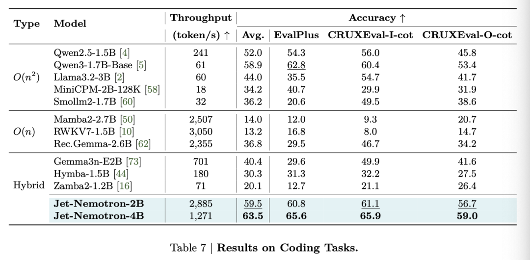 编码任务上,Jet-Nemotron-2B的平均准确率高于所有基线模型。