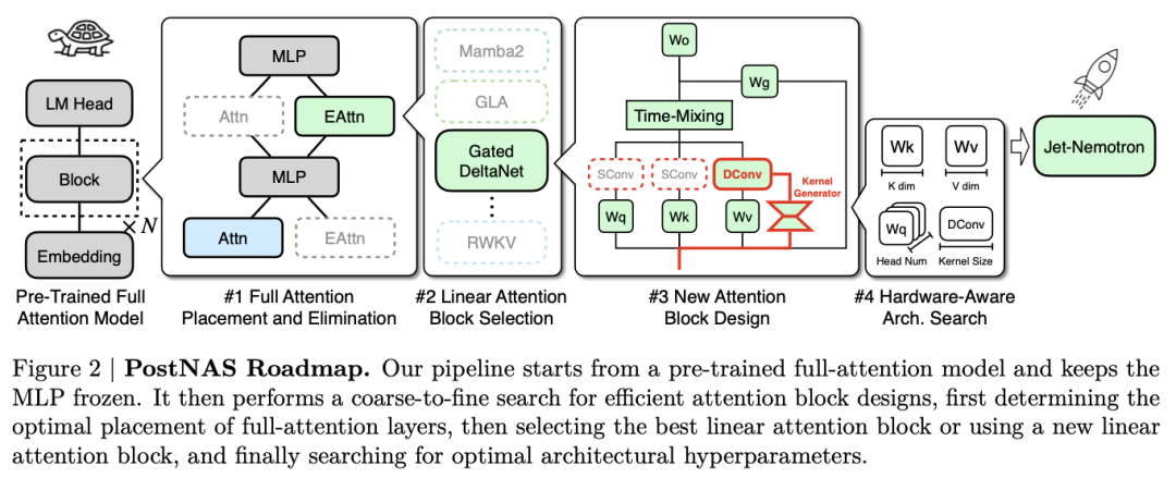 首先,Jet-Nemotron是在后神经架构搜索(Post Neural Architecture Search,PostNAS)的基础上构建的。