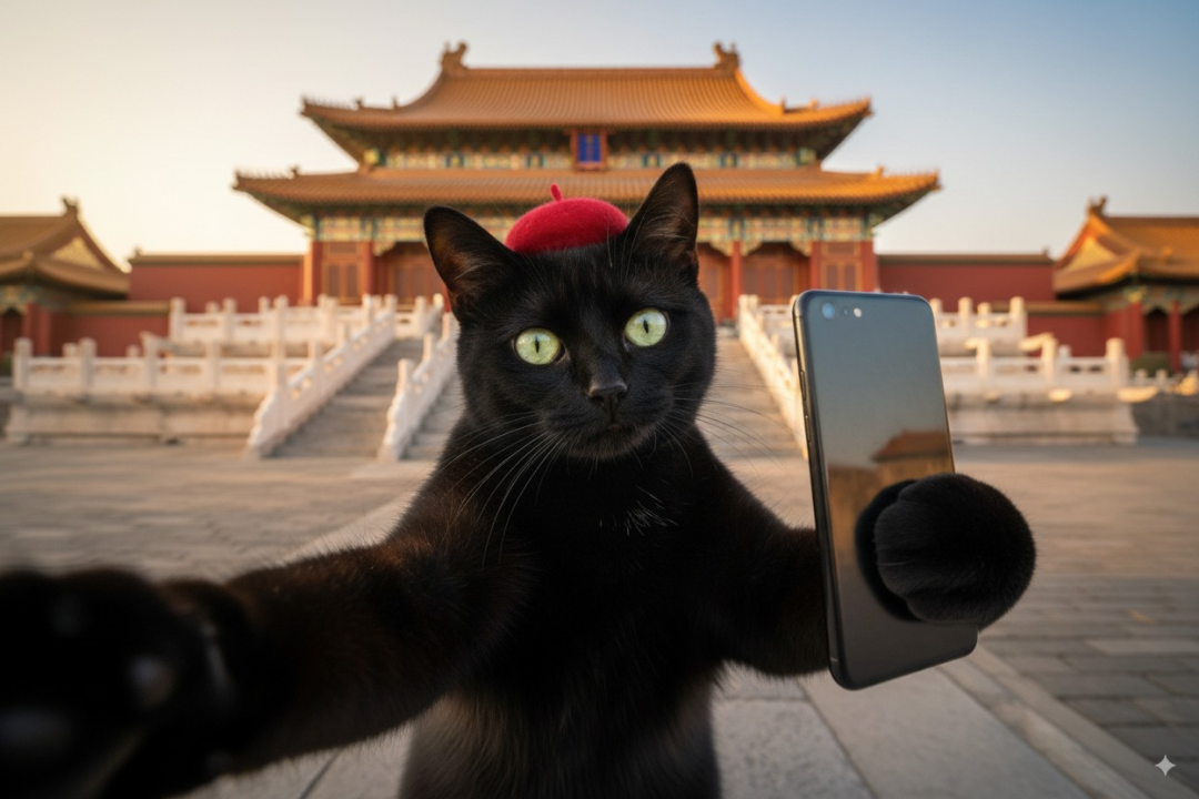 提示词:让猫猫去故宫拍张自拍照。