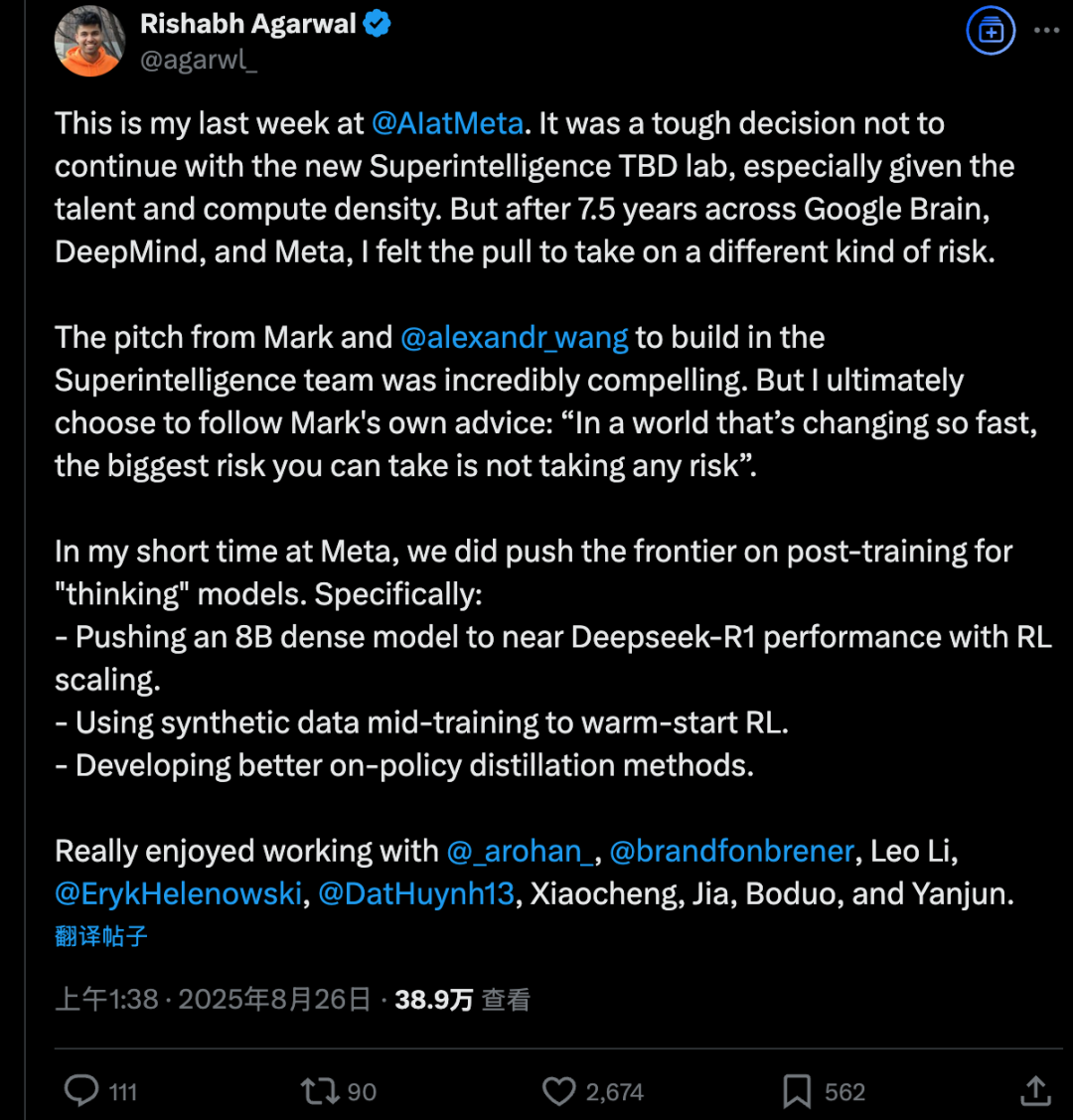 另一位离职的Meta研究员Rishabh Agarwal在社交媒体上公开宣布离职时写道:“离开新成立的超级智能TBD实验室是个艰难的决定,特别是考虑到这里的人才和算力密度。但在谷歌大脑、DeepMind和Meta工作了7年半之后,我感到是时候承担不同类型的风险了。”