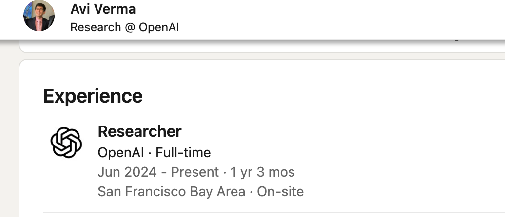 Avi Verma曾是OpenAI研究员,短暂的加入Meta一个月就回去了,甚至连领英界面都没有留下Meta的痕迹。