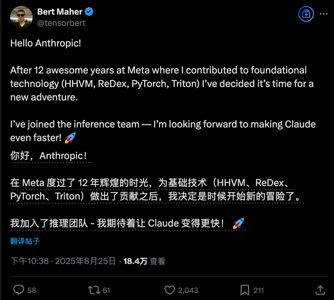 PyTorch和Triton的核心开发者Bert Maher选择加入了竞争对手Anthropic,这对Meta的AI基础设施建设团队是个不小的打击。