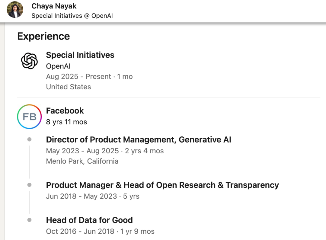 Meta还失去了一位工作了近十年的领导者。据两位知情人士透露,Meta生成式AI产品管理总监Chaya Nayak加入OpenAI作为“特别行动人”。