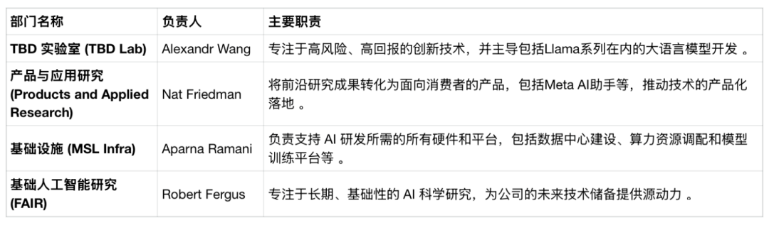 就在人才矛盾愈演愈烈的时候,Meta又进行了一次大规模的组织调整。整个AI工作被分拆为四个部门:前沿研究团队(TBD Lab)、AI产品、基础设施和长期探索(FAIR延续),全部归属于新成立的Meta超级智能实验室。