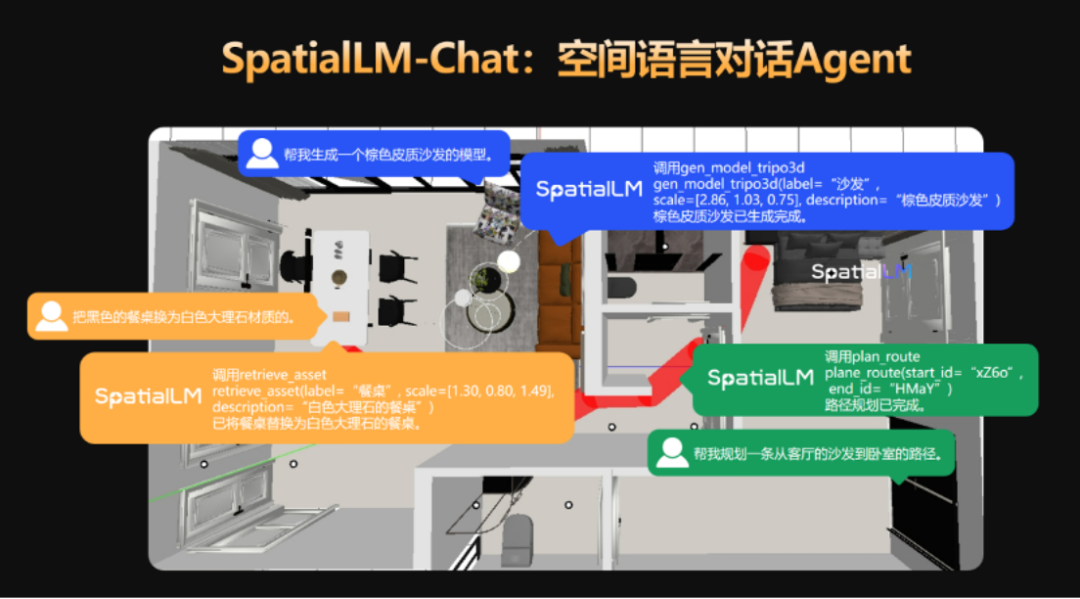 再来看复杂空间任务处理能力。SpatialLM1.5可以被打造成AI Agent框架,通过调用工具来拥有更多的空间能力。