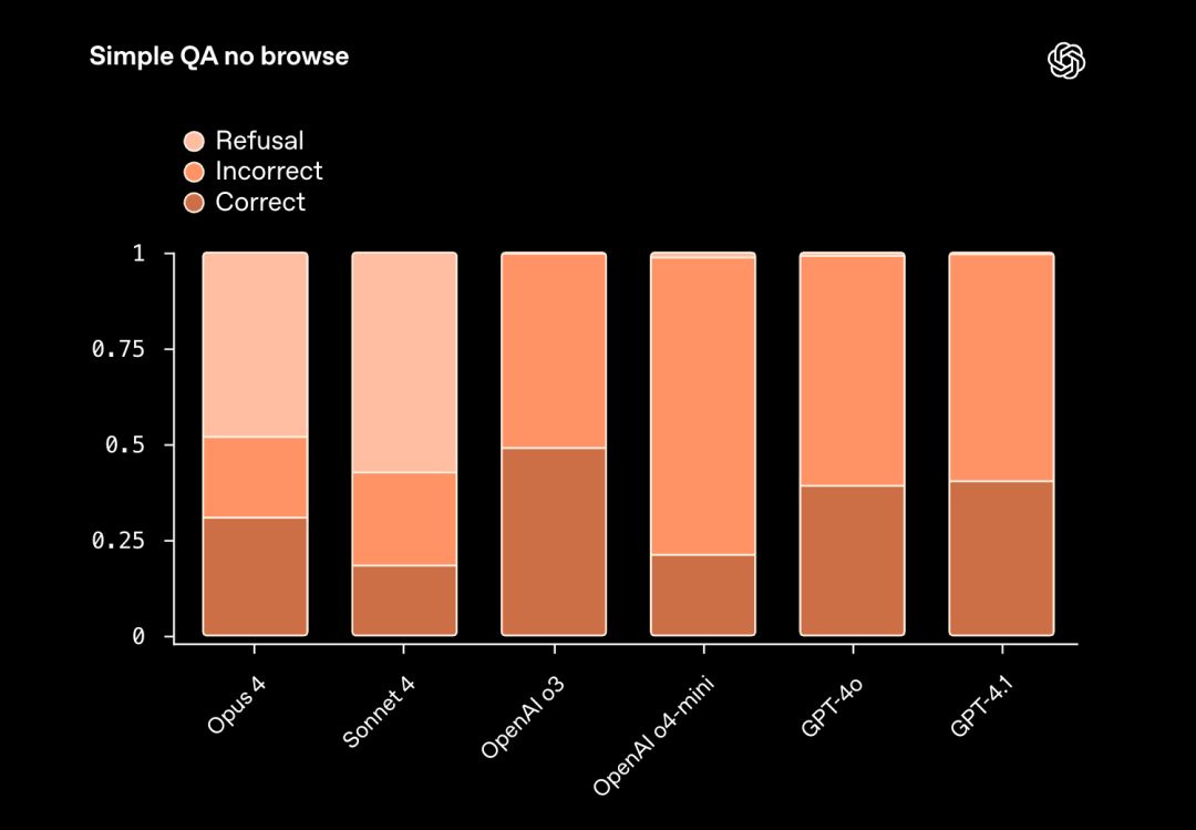在幻觉(Hallucination)方面,Claude模型在不确定答案时拒绝高达70%的问题;虽然o3和o4-mini拒答率较低,但幻觉却更高。