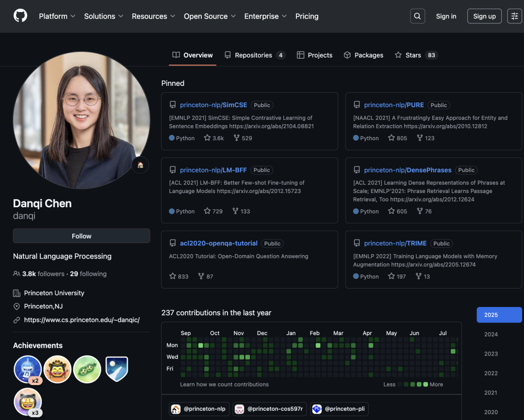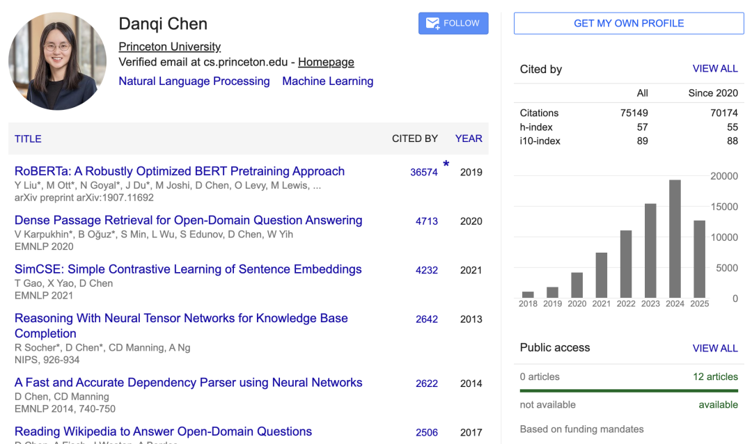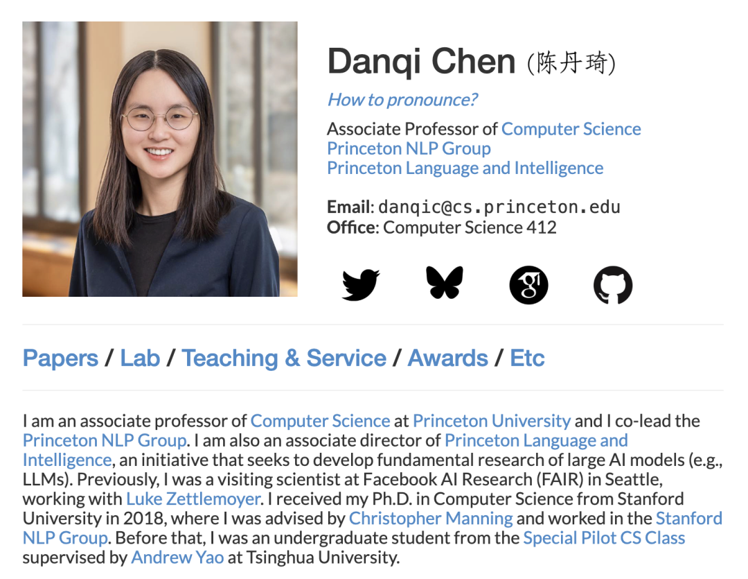 目前陈丹琦还在普林斯顿大学担任副教授,以及NLP小组的联合负责人。