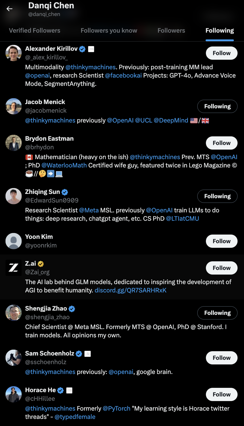 而进一步发现,在她账号关注的最新名单中,一眼望去几乎全是Thinking Machines在职科学家。