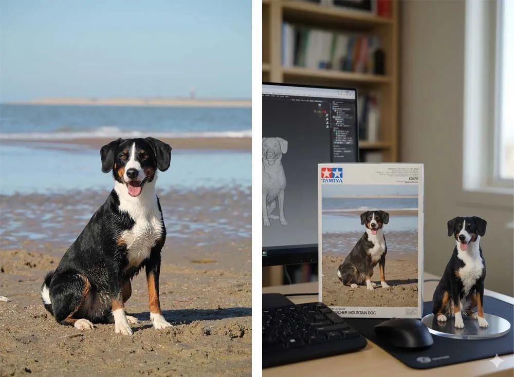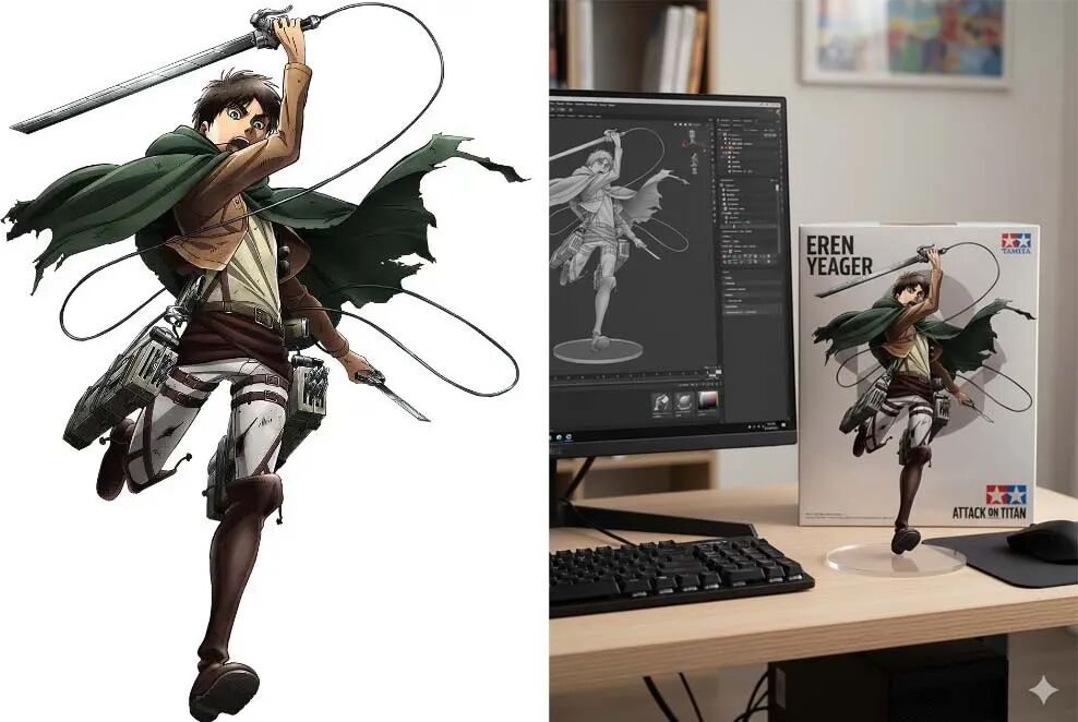 (中译方便对照版:使用nano-banana模型制作一个1/7比例的实体模型,风格和环境保持写实。将模型摆放在电脑桌上,底座为圆形透明亚克力材质,且不带任何文字。电脑屏幕上显示的是该模型在ZBrush中的建模过程。在电脑屏幕旁边,放置一个TAMIYA风格的玩具包装盒,包装盒上印有原始插画。)