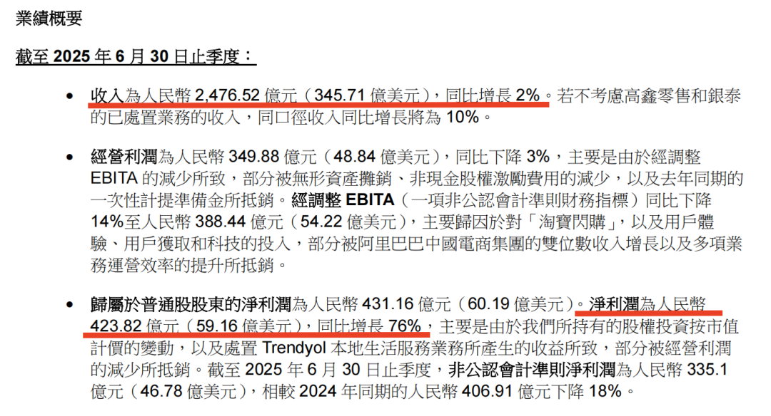 2025年第二季度,阿里巴巴总营收2476.5亿元人民币,同比增长仅2%,但净利润却暴涨76%达到423.82亿元。这种营收低增长与利润高增长的巨大反差,反映出公司正处于战略转型的关键时期。