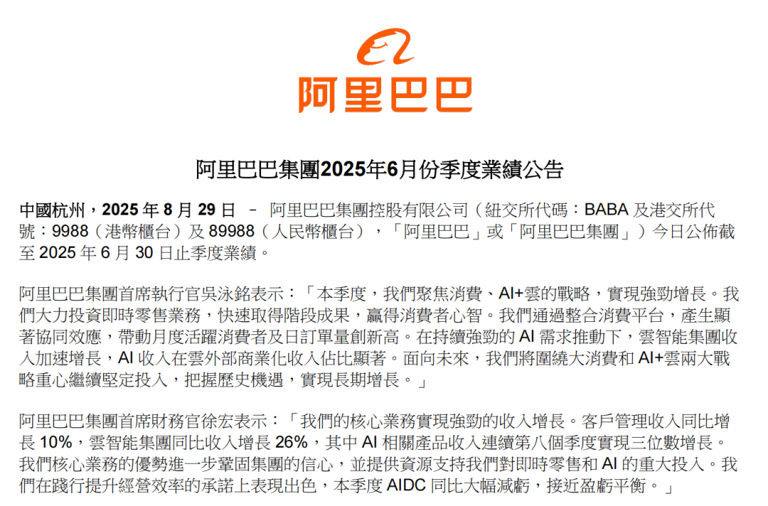 吴泳铭表示,面向未来,阿里还将围绕大消费和AI+云两大战略重心继续坚定投入。