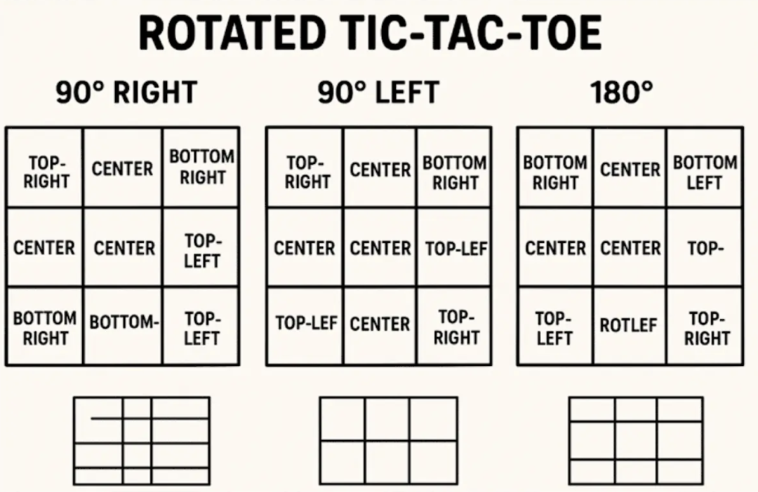 玩家们早已习惯了“直立”的井字棋棋盘,旋转可能会微妙地改变他们识别威胁与机会的方式。从数学角度看,将棋盘旋转90度并不会改变可能获胜的组合,就结果而言,它仍然是同一个游戏。但从心理层面来说,玩家的感受可能会有所不同。