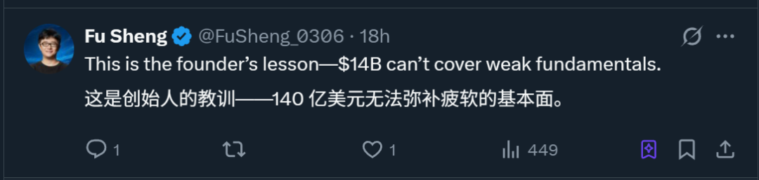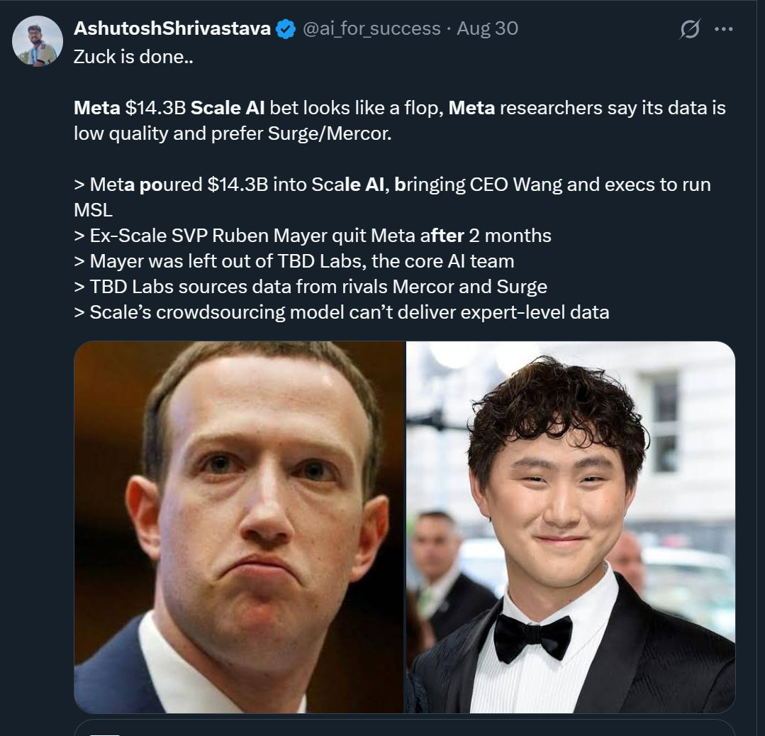 毕竟Meta后来在Scale AI身上花了重金,算是自家人,结果“肥水竟然还是流了外人田”。