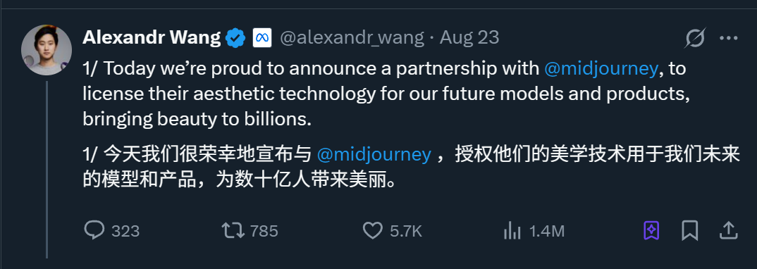 大约两周之前,Alexandr Wang就宣布,已与Midjourney创建合作关系,将该公司的技术应用在Meta未来的模型与技术中。
