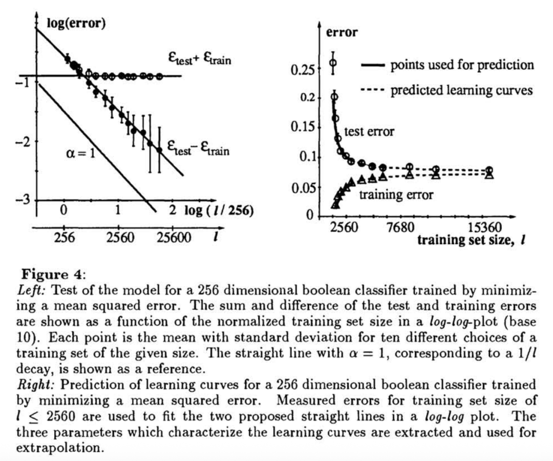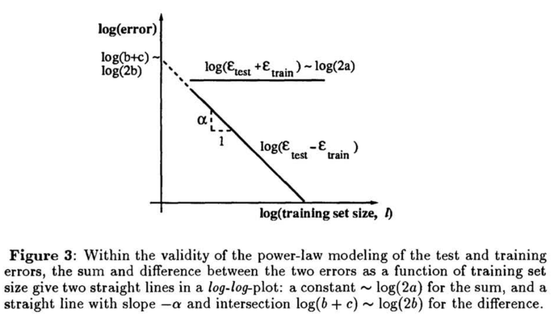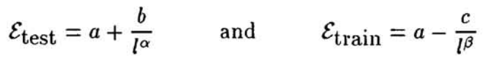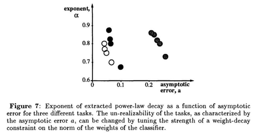 它首先在几个中等规模训练集上分别计算测试误差、训练误差,然后他们发现,随着训练集的规模变大,训练误差和测试误差都会收敛到一个相同的渐近值a,这个指数a在0.5-1之间。
