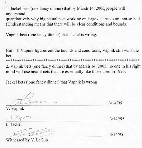 1995年,Vapnik还和当时的上司Larry Jackel以一顿豪华晚餐打赌,到2000年时,人们能不能解释清楚大型神经网络为什么在大规模训练中表现很好?