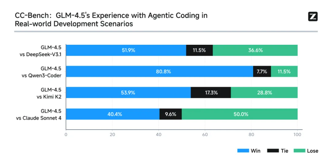 在与Claude Sonnet 4的直接竞争中可以发现,GLM-4.5在编码性能方面接近行业标杆Claude Sonnet 4。