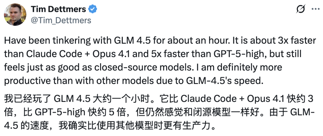 并且,艾伦人工智能研究所研究科学家Tim Dettmers体验后表示:开源的GLM-4.5在推理速度上和闭源模型一样好,甚至比Opus 4.1快3倍、比GPT-5快5倍。
