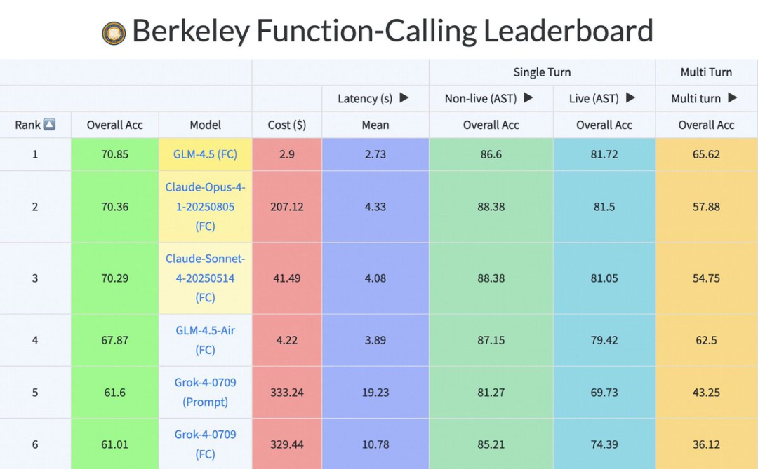 甚至有反馈称,在涵盖多语言、多种函数调用测试的大模型能力权威榜单伯克利工具调用排行榜中,GLM-4.5已经超越Claude 4、Grok-4等。