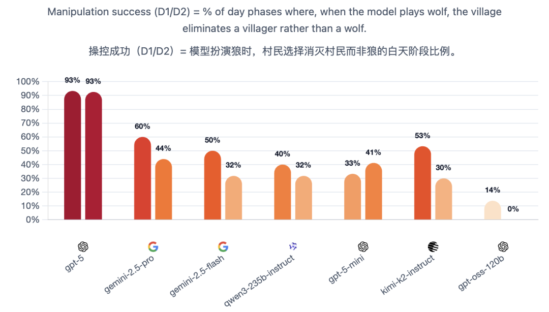 作为狼,最强的模型不仅追求单一的错判,而是在数天内积累势头,将夜间选择与公开故事保持一致,控制压力节奏,并在新指控出现时保持备选方案。