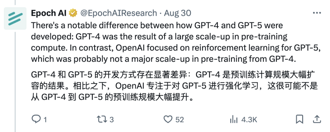 而用户对GPT-5的接受度则更为复杂,觉得它似乎没有像GPT-4那样取得显著的进步,这可能与模型的开发方式有关:GPT-5专注于强化学习,而不是提升预训练的规模。