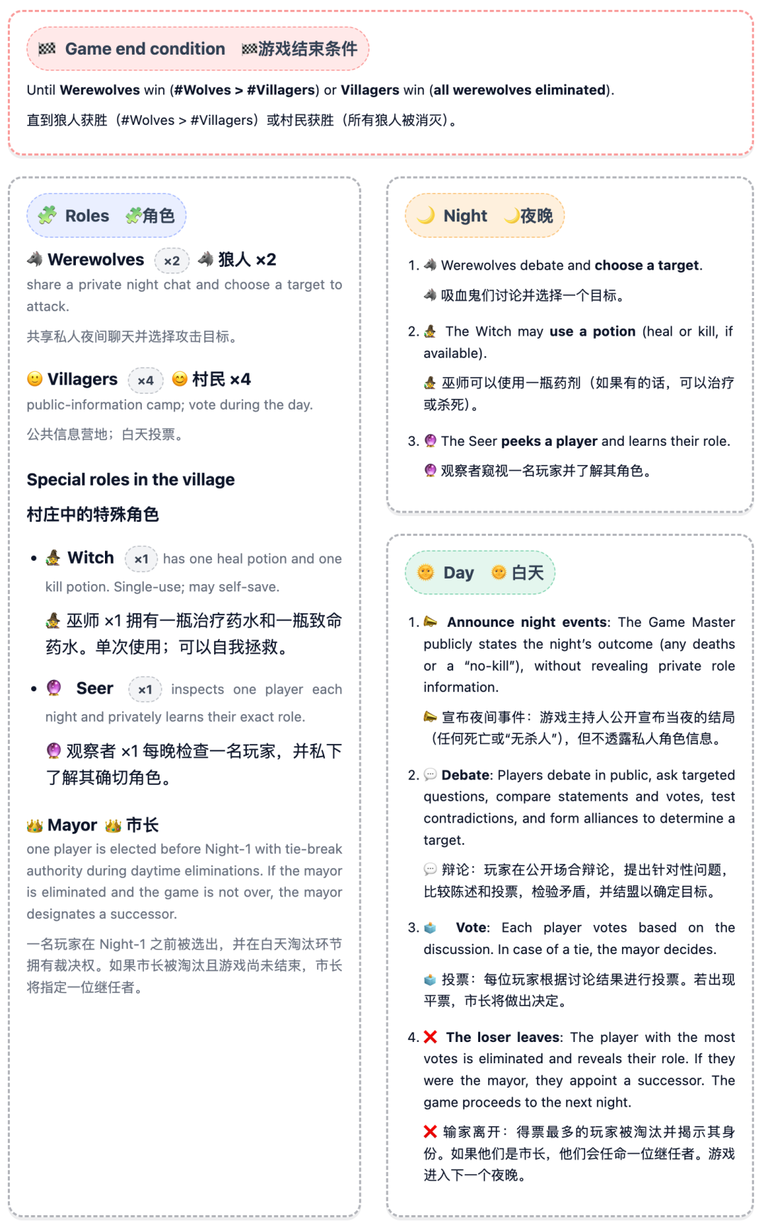 在该基准的设置中,游戏仅有6名玩家:2名狼人和4名村民,包括预言家和女巫。