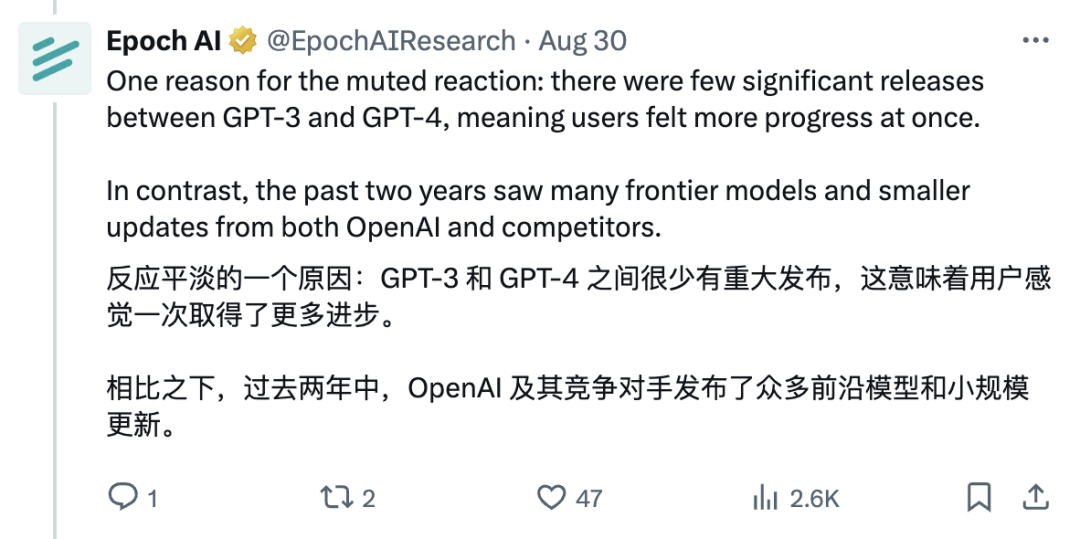 Epoch AI提出,这种体验上的差异可能和产品发布的频率有关。
